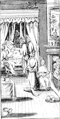 In the image that accompanies the title page of Aristotle’s Compleat and Experience’d Midwife (1700), the birthing chamber is depicted as a room full of lively, fleshed-out bodies, warm and inviting from the fireplace to the small animal sleeping in front of it. The baby is not pictured at all; the experienced midwives gather around the pregnant woman, who lies in what looks to be a rather comfortable bed, although her body seems tense and rigid, likely from the experience of childbirth, one that Linda Pollack, writing on childbirth in the period, describes as “fraught with obstacles and dangers from beginning to end” (40). She is surrounded by experienced professionals, family members, and friends while their hands tend to her during this painful, transformative time.