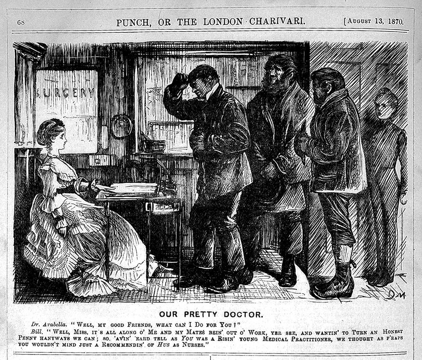 Featured image: An attractive female doctor being approached by three burly men enquiring about nursing work. Wood engraving by G. Du Maurier, 1870. Wellcome Collection. Public Domain Mark