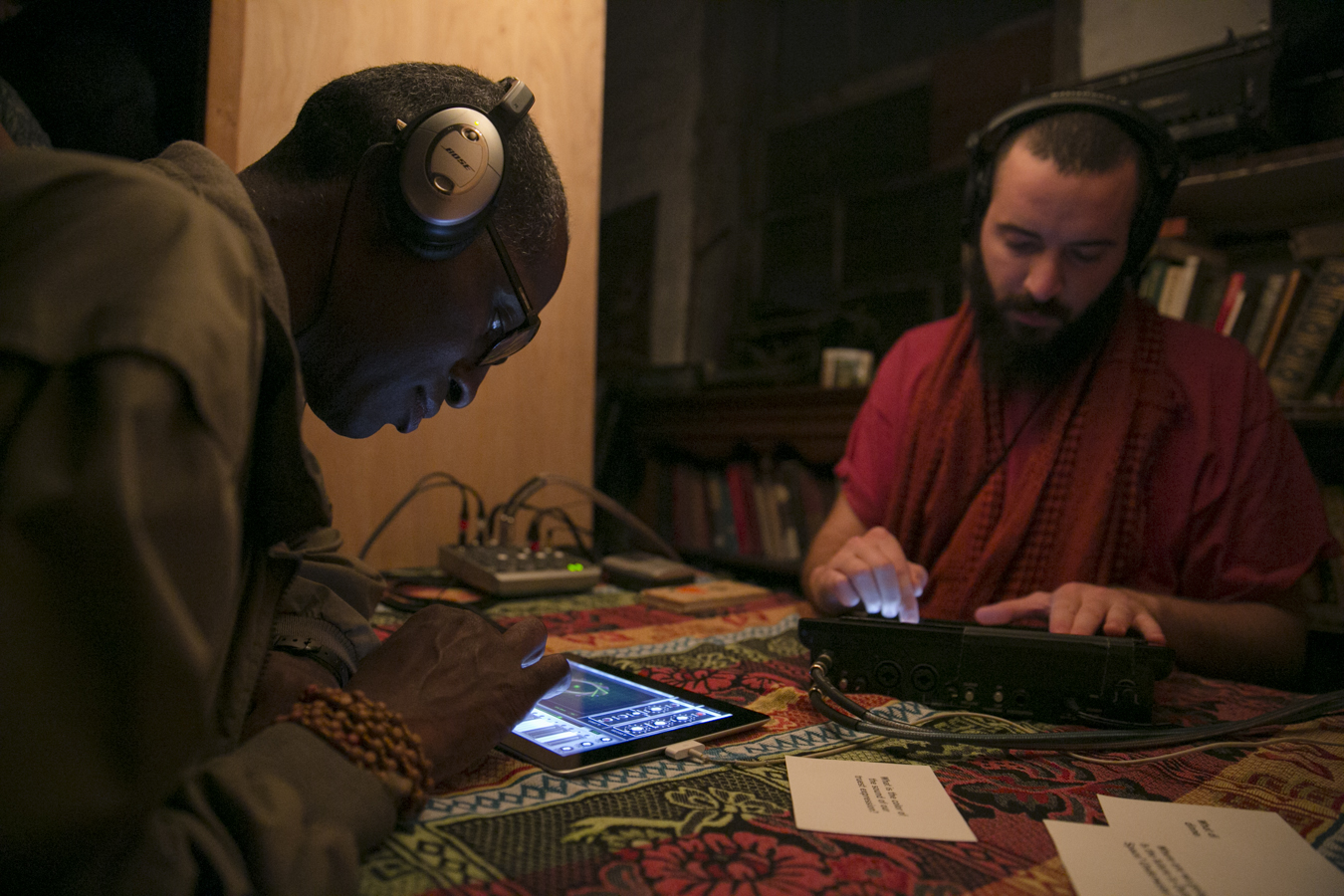 Bennett Kuhn // Around us were dusty stacks of forgotten hardcover books and crowd members circulating in the now-defunct Beaumont Warehouse venue in West Philly. The three-night immersive multimedia art project called Going There was in full swing, and a short queue led up to the table where I sat with two synthesizers welcoming strangers like aural palm readers. The Empathy Chamber was just one component of Going There, which brought nine Philadelphia-based artists in close contact imagining an aesthetic practice based on community building through disclosed vulnerability.