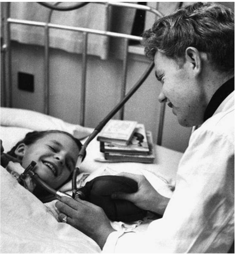 Indeed, by the mid-twentieth century, a patient’s vital signs were not only tracked but also supported and augmented on a beat-to-beat basis. The first proof of concept came during a 1952 outbreak of polio in Denmark. The disease had robbed many of their ability to ventilate their lungs on their own, due to paralysis of muscles of respiration. The prognosis for these patients was grim because the Blegdam Hospital for communicable diseases had only seven respirators for the 316 patients admitted. Dr. Bjorn Ibsen, a Copenhagen anesthesiologist, offered a solution: positive airway pressure as used in the operating room. A tracheostomy—an incision in the neck to open the trachea—could be made, rubber tubing fed into the hole, and air pumped in via a hand-compressed rubber bag. It took a small army of about 250 medical students in several shifts constantly manually ventilating patients in order to bridge the crisis. Mortality fell from 80% to 40% (Kelly et al, “Intensive Care”). The use of positive airway pressure in the setting of polio was not new (first recognized in 1950), but Dr. Ibsen’s lasting contribution lay in the understanding that positive airway pressure ventilation could be mobilized for a variety of disease states beyond the polio crisis, making critical care as a broader clinical practice possible (Reisner-Sénélar, “The birth”). This discovery served as a critical impetus for the emergence of ICUs across the world. In the early 1960s, Dr. Max Harry Weil opened a four-bed unit for shock patients at LA County-USC Hospital, and other hospitals followed suit (Vincent, “Critical Care”). The trend spread, a marriage of assiduous management of vitals and the audacious application of technology.