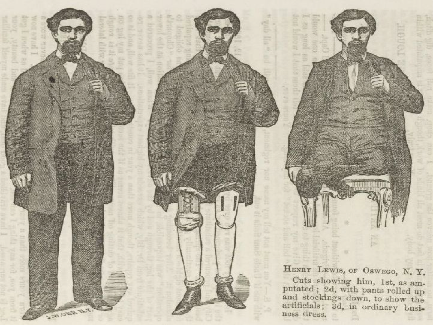 As is discernible in the images above, artificial legs function as objects facilitating the concealment of their missing counterpart(s). This is because the nineteenth century prosthesis users/wearers yearned to hide their impairments and escape the social stigma that “disability” enforced upon them. Because it was the “age of appearances,” in which people were obsessed with the ideals of organic wholeness, and social acceptance was based on one’s external comportment and demeanor, prosthesis was the answer to the compelling demand of concealment and external perfection.