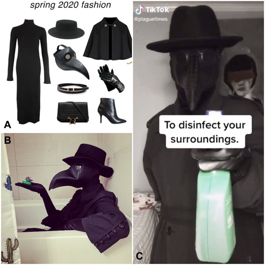 Steeped in our current context, the stage was set for the Plague Doctor, that iconic masked medical icon, to make a comeback. Memes predicting Spring 2020 fashion replete with black capes, canes, and beaked masks flooded social media in March 2020, as the rapidly increasing number of COVID-19 cases made global headlines (Figure 1). Folks in beaked masks wandered onto live on-location newscasts. TikTok stars like Dr. Miasma (@plaguetimes) reminded a rapt online audience to wash their hands. Using props gathered for teaching undergraduate anthropology courses on infectious disease, and being an extrovert trapped in social distancing mode, I myself started a daily photo series featuring a Plague Doctor encouraging creative pursuits and self-care while self-isolating. The organic appearance of these media demonstrates the Plague Doctor’s powerful juxtapositions: the image is historical yet current, sinister yet welcome, celebrating life yet embodying death.