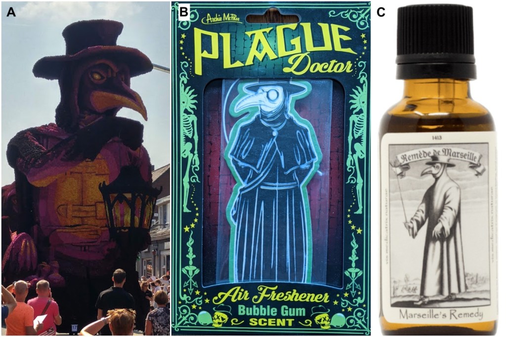 Plague Doctors easily integrated themselves back into cultural consciousness because while Yersinia pestis’s grip on human history was loosened with the advent of antibiotics, the evocative Doctor did not fade. We find the Doctor’s image capitalized upon in television shows, album art, skateboard decorations, plush toys, and, particularly ironically, as air fresheners (Figure 4). Marseille’s Remedy, an essential oils blend, is branded with Fürst’s Plague Doctor. The image is clearly employed to legitimize the products with a sense of medical history and tradition; however, the message is muddied as the 17th-century image of Rome is labelled as 15th-century France. The sombre beaked, cloaked, and hatted figure struts his danse macabre each year in Venice’s carnival as the popular commedia dell’arte figure Il Medico della Peste. Similarly, the doctor was a popular dahlia float at the 2018 Bloemencorso Zundert, touted as the world’s largest flower parade. The character in these contexts is entertaining, but ultimately anodyne – there is little dread associated with encountering the doctor at a modern pageant or dangling from the rear-view mirror. And yet, more contemporary popular cultural appearances of the Plague Doctor have become ever more ominous in nature.