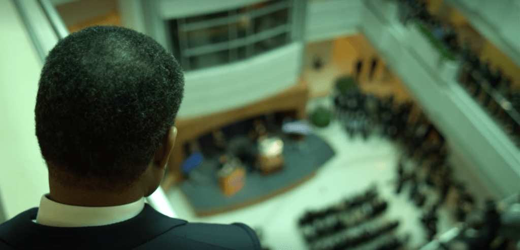 At left: an image of a lottery machine, half-filled with numbered balls. Housebound citizens watch anxiously on televisions, waiting for their birth date to be called, disappointment mounting as it becomes clear their vaccination will now be happening fairly late in the process. The lottery itself is overseen by a military official in the precincts of the CDC, seemingly conferring upon the operation an air of order and efficiency. After a moment of spinning action generating suspense amongst the viewing audiences both within and outside the film, the ball drops from the basket, its number causing jubilation for a few, and dashing the hopes of millions more.