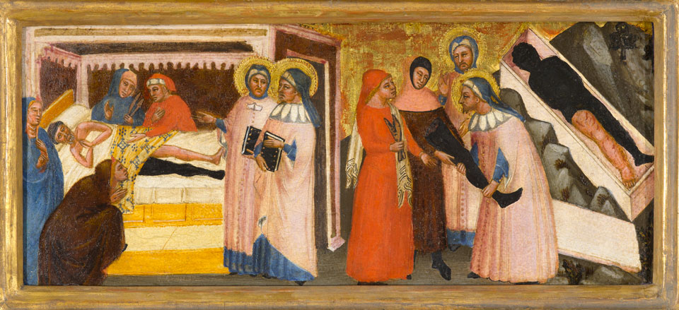 The legends of Saints Cosmas and Damian, the patron saints of medicine, pharmacy, and surgery, are dramatic miracles to the highest degree. These early Christian martyrs lived and died in the third century, in what is now modern-day Syria. As two traveling doctors, the saints refused to take payment for their services, and subsequently received the epithet anargyri (Greek ανάργυροι) meaning “the silverless ones,” which underscored their Christian humility. Together, they performed cures of ailments like blindness and paralysis, resolving fevers and everyday sicknesses. Other times, their legends present them in their more necromantic element: raising the dead, expelling snakes from the breast, and praying with camels. But in the Middle Ages, these two holy physicians became best known for their miracle of leg transplantation. The saints’ leg-grafting miracle was popularized in Jacobus de Voragine’s thirteenth-century compilation of saints’ lives, the Legenda Aurea (the “Golden Legend”). De Voragine’s Latin translation of the Greek stories is the first text to describe the grafted leg as Black.[1] The miraculous transplantation occurs between a Black man and a white verger.