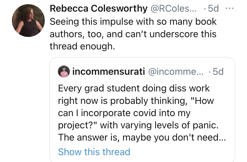 Very recently, I read an insightful thread by a colleague, Aren Aizura, on the mistaken belief that graduate students need to somehow incorporate COVID-19 into their dissertations: