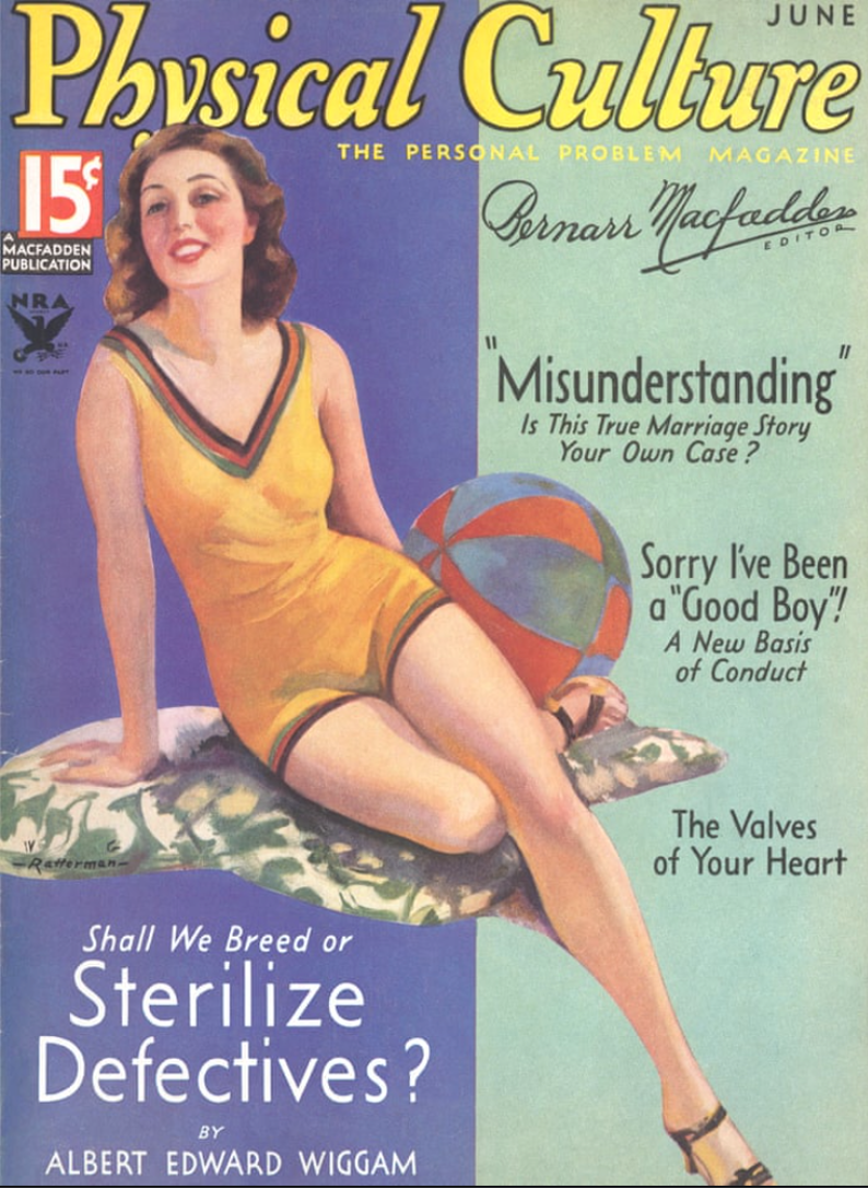 The Physical Culture magazine cover from the 1930s (above) mobilizes both forms of eugenics and thus allows us to differentiate between the two. The magazine cover draws the observer’s eye to the woman in the center: a white-presenting, slim, and fashionable woman spending a leisurely day at the beach. To the right of this woman are titles of stories that fit neatly within the boundaries of traditional American family-planning tropes. One features marital advice, another alludes to the importance of finding a “good” man, and the third takes readers on a tour of the organ most frequently associated with love. Together, the woman’s image and the stories referenced on the right side of the magazine cover communicate a positive eugenic statement: love, marriage, and eventually procreation are expected from women who look like this. However, the bottom left corner of the cover references an article written by Albert Edward Wiggam—a renowned eugenicist, whose writings were praised by Hitler—titled “Shall We Breed or Sterilize Defectives?”. This proposed question, and its assumption that readers of the magazine hold decisional authority over the matter, is a profoundly disturbing example of negative eugenics. By asking “Shall we?”, Wiggam casts his audience—presumably individuals who resemble the racial, socioeconomic, cultural, or educational profile of the woman depicted on the cover—as having the power to determine the reproductive fate of women considered to be somehow lesser, somehow “defective.”