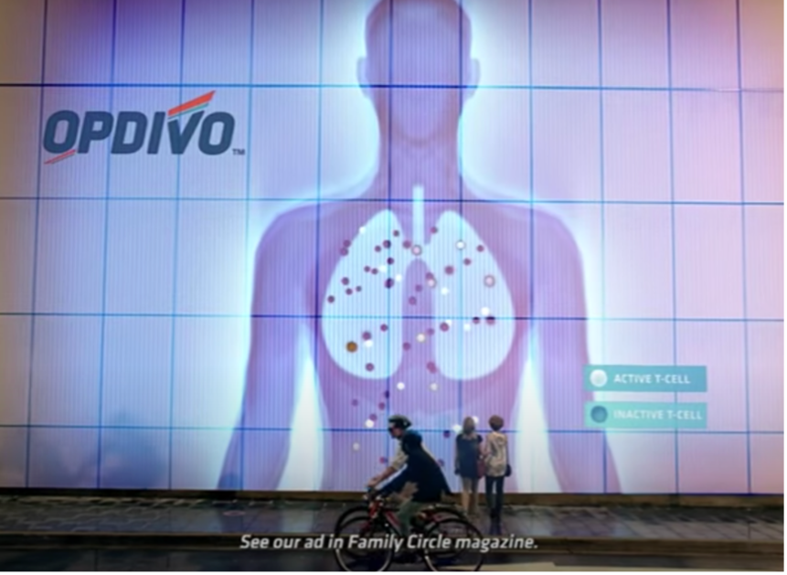 The individuals in the ad are subjects of biopower in that they voluntarily stop what they are doing to receive the Opdivo messages, and they receive these messages with what appears to be unquestioning reverence. The possibility of extending the lifespan is not just enticing; it is what the patients were looking for all along, and without which they would remain in darkness.