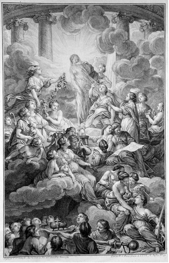 The scene is reminiscent of a print of the frontispiece of the Encyclopédie (1772), originally drawn by Charles-Nicolas Cochin and engraved by Bonaventure-Louis Prévost.