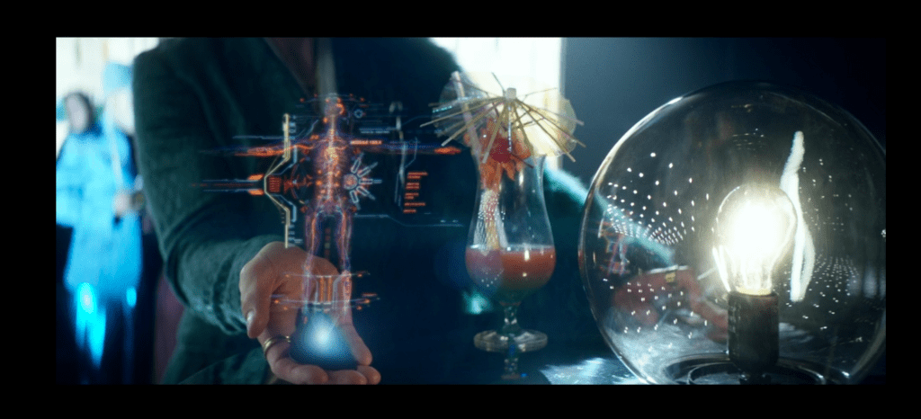 While La Forge’s visor represents an ethical use of cybernetics and prosthetics, on the opposite end of the spectrum are the Borg, who represent the most profound abuse of artificial biological augmentation. Rather than address ability and accessibility, the Borg force their subjects to become technologically augment and linked to each other in the name of efficiency, deindivuated as drones who serve a hive mind. As the experiences of both Picard, who was temporarily made Borg, and Seven of Nine (Jeri Ryan), the ex-Borg who eventually joins Picard’s mission, make clear, being assimilated leaves tangible internal and external anatomical signposts. In a ploy to recover a cybernetics expert being held hostage in episode 5, Seven is used as a decoy to lure the ex-Borg parts trader holding him captive into a negotiation. Having been assimilated as a child, Seven’s biological anatomy and physiology is inextricably bound with technological enhancements and internal regulation systems. When Rios demonstrates this to a buyer, he does so using a series of miniature holographic projections. They resemble nothing so much as anatomical textbook illustrations, with vascular systems and implants supplanting each other in quick succession—reducing a living person to a flap anatomy or static two-dimensional rendering.