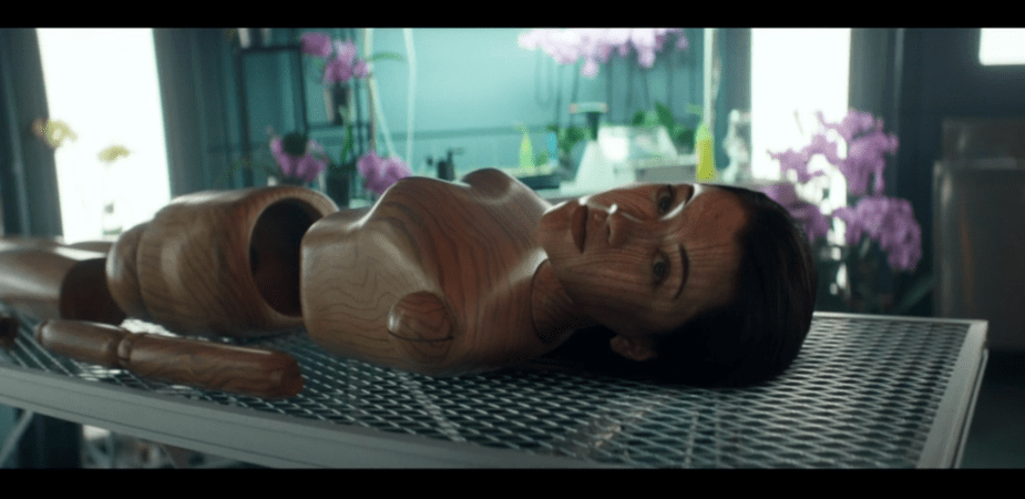 In a parallel vision in episode 6, we see Soji’s primal horror through her eyes, in a recollection that suggests her sublimated self-knowledge: a vision of herself as a disassembled manequin, her personhood reduced to raw contours. In a recovered memory, Soji sees herself reduced to shorthand for a body, like a marionette: a torso, a head, a finial-like pole that suggests an arm, and a hollow interior. The disassembled body lies incomplete against a backdrop of orchids, suggesting biological fidelity, cultivation, and manipulation.