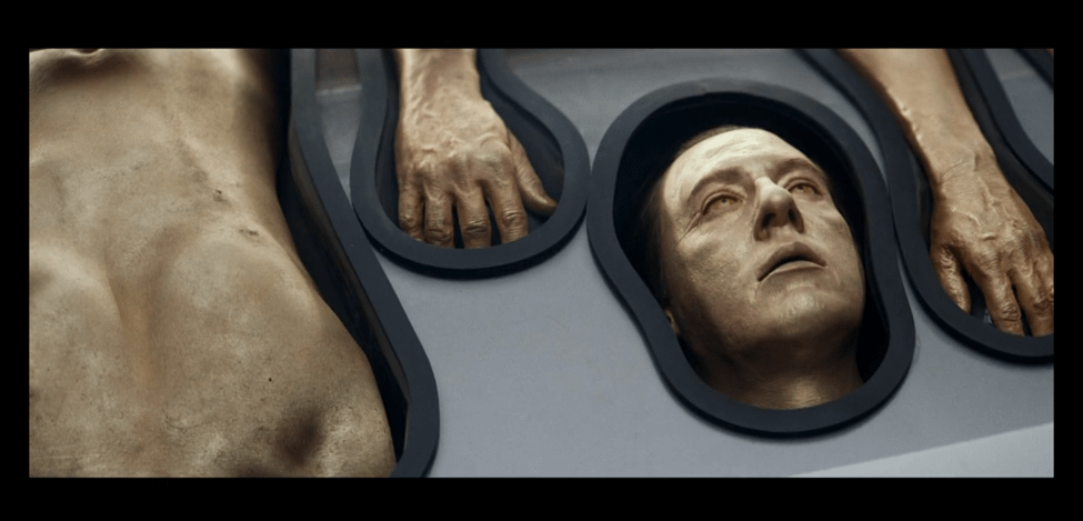 Unlike the B-4, this mannequin’s parts are laid out in anatomical order, like a skeletal model ready for animation (or at least to visually recall it through linear assembly and display). But while the pseudo-Data B-4’s eyes stare into the middle distance from its drawer, this being’s eyes are not only open, but focused. While this is an acknowledgement of Soji’s essentially compromised personhood as a synthetic being, the model’s gaze suggests a challenge. The being that witnesses and assesses its own creation must, inherently, have personhood—even if its anatomical fidelity to humanity is the result of synthesis, one that may be interrupted or undone by human intervention.