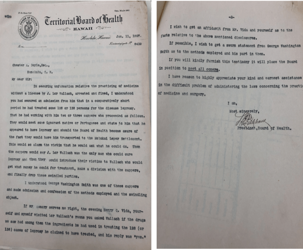 When looking back through the almost 260 photographs of documents on my Google Drive, one piqued my special interest. It was a piece of correspondence by the President of the Board of Health of Hawaii in 1907, Lucius Pinkham (Fig, 1). The letter talks about the arrest of a man named J. Lor Wallach who, according to Pinkham, had divulged the fact that he had been treating leprosy without a medical license. Moreover, Wallach used “cappers” to trap these unsuspecting people to try his remedies; the cappers would falsely attest to the effectiveness of Wallach’s medicines and coax the lepers to try them as well. I followed this lead, finding mention of Wallach in such newspapers as the Pacific Commercial Adviser, according to which Wallach had ignited a full-blown political controversy with Republican, Democrat, and Home Rule parties having vested interests.