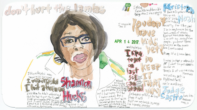 Although her own story is quite different from Adichie’s, Canadian-born performance artist Charmaine Wheatley is equally invested in showcasing the multiplicity of human experiences and identities. Wheatley’s art confronts the consequences of a single story by using drawings and watercolors to animate life. Her compositions reflect intimate moments between Wheatley and her sitters, capturing physical likenesses and fragments of conversation. Wheatley’s pocket-sized portraits offer a glimpse into the struggles and joys that each individual carries with them.