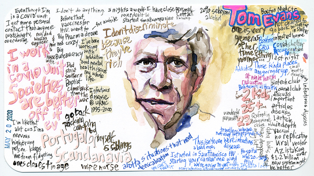 Wheatley also spoke with health experts to hear from people experiencing a different side of COVID-19. Dr. Tom Evans, an Infectious Disease doctor and researcher based out of Oxford, England, was working in Boston at the time of this portrait in May of 2020. Evans is one of the many front-line workers who has been treating patients in COVID units throughout the pandemic. Evans told Wheatley that he felt fortunate to have more personal contact than most, since he was treating the homeless three nights a week after his regular shifts in the hospital. Evans’ portrait offered insight into the human connections that healthcare workers were making in the midst of a health crisis and nationwide lockdown.