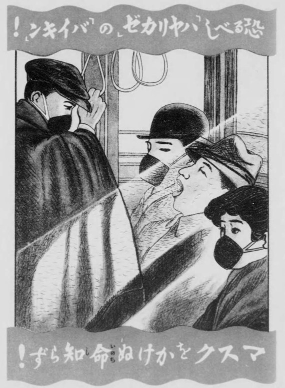 Naimushō eiseikyoku [Hygiene Bureau, Ministry of Home Affairs], Ryūkōsei kanbō [Influenza] (Tokyo: Naimushō eiseikyoku, 1922), 132–133, https://dl.ndl.go.jp/info:ndljp/pid/985202/94. Accessed January 7, 2022 via the National Diet Library Digital Collections. The caption reads “Terrifying ‘germs’ of the ‘influenza!’ Without wearing a mask your life will be at risk!”