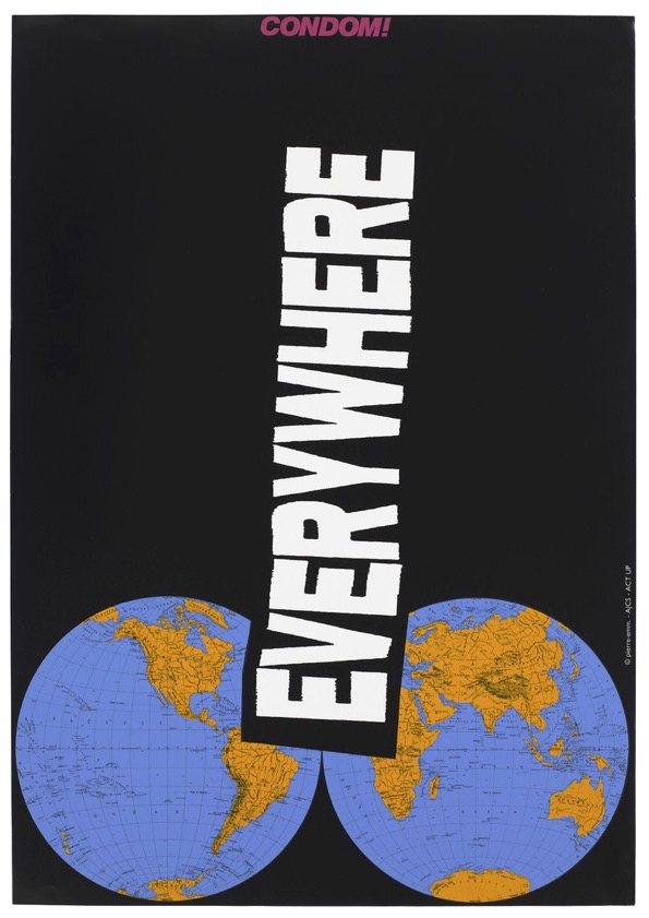 Image: Two world maps against a black background with the words ‘Everywhere’ and ‘condom’; an advertisement for safe sex by Pierre Emm [Meunier] for ACT-UP, AIDS Coalition to Unleash Power. Colour lithograph. Source: The Wellcome Institute.