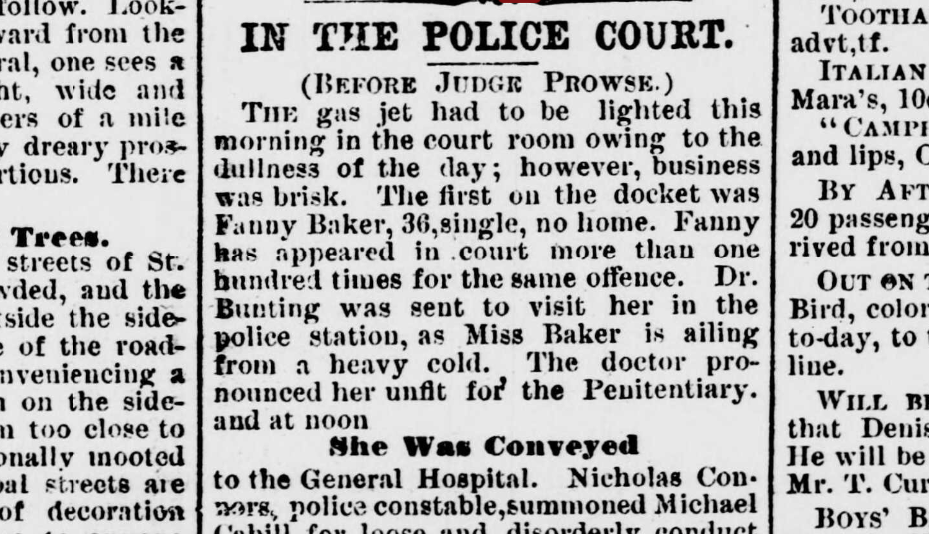 Many of Fanny’s health issues were directly related to her struggle to obtain and maintain a place to live. She spent 24 days in hospital in September of 1897 with a diagnosis of “no home.” In 1896 the Evening Telegram states that she “spends so much of time in the penitentiary that she now considers it her home” (Evening Telegram, January 15, 1896, 4).