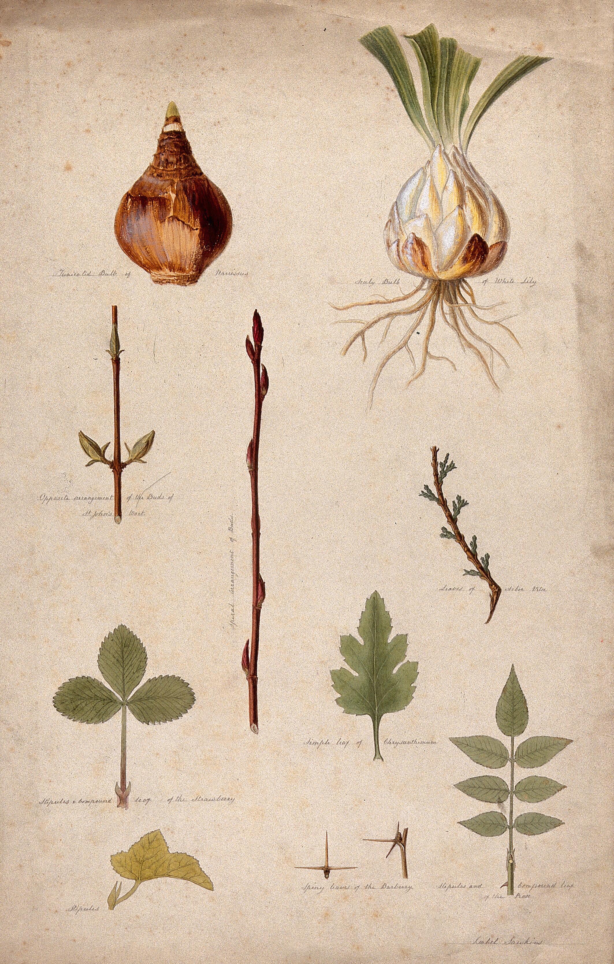 Isabel Sawkins. Various leaf forms, leaf arrangements and bulbs. Watercolour. (CC). Wellcome Image Collection. https://wellcomecollection.org/works/enxpswxq