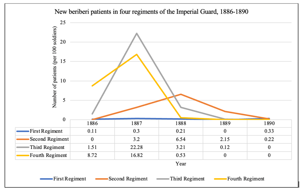 Chart 1: Number of new beriberi patients in the Imperial Guard, 1886-1890