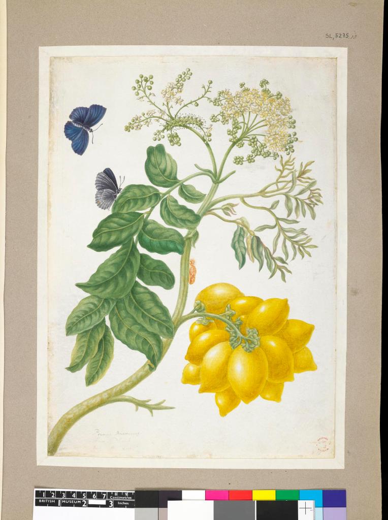 Image Source: “Lemon plant bearing fruit, from an album of 91 drawings entitled ‘Merian’s Drawings of Surinam Insects &c’;” Watercolour, with pen and grey ink, on vellum. CC BY-NC-SA 4.0. © The Trustees of the British Museum.