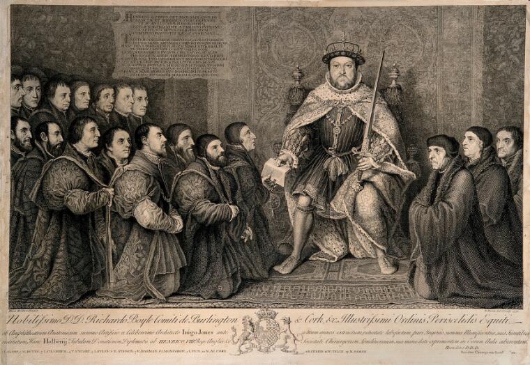 Image: King Henry VIII granting a Royal Charter to the Barber-Surgeons’ Company. Engraving by B. Baron, 1736, after H. Holbein, 1542. Via Wellcome Collection (Public Domain).