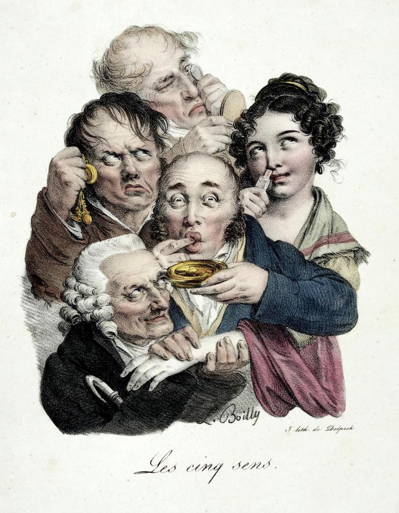 Header Image: Five people, each exercising one of the five senses. Coloured lithography by Louis Boilly, 1823?.