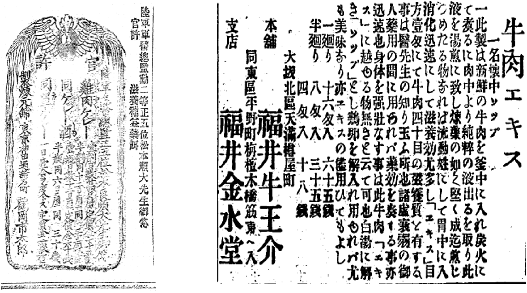 From the mid-1870s, advertisements for milk and meat products appeared frequently on daily newspapers in big cities like Tokyo and Osaka. Often published on the same page with advertisements for medicines, they labelled milk and meat products as healthy delicacies. In 1876, customers could buy 180 ml of nourishing “fresh milk from U.S.-exported cows” in the Akasaka (赤坂) area for 4 sen (Yomiuri Shimbun, June 1, 1876, 4). From butcher Nakagawa (中川) in the Shiba (芝) area, one could buy “health-cultivating beef” (go yōjō gyūniku, 御養生牛肉) which was delicious and so soft “that even people with weak teeth could enjoy” (Yomiuri Shimbun, March 30, 1879, 4). To better utilize animal meat for health purpose, they developed “life-nourishing beef alcohol” (meiyō gyūniku shu, 命養牛肉酒), chicken gelei (keiniku kerei, 鶏肉ケレー), chicken gelei alcohol (keiniku kerei shu, 鶏肉ケレー酒), beef gelei (gyūniku kerei, 牛肉ケレー) and beef extract (gyūniku ekisu, 牛肉エキス). According to the advertisements, women could assure easy delivery of robust babies by eating chicken gelei (Dutch for jelly). One could eat beef gelei to nurture his or her vigor (Yomiuri Shimbun, January 27, 1881, 4). By adding egg into soup made from beef extract, people could cure their lethargy.