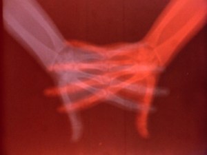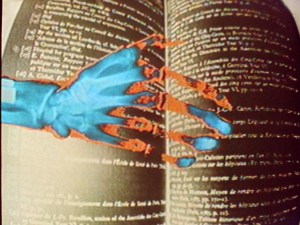 Towards the end, pages of a book flow on the screen with a close-up. The book is superimposed with faintly visible skeletons. Words pass very quickly in front of our eyes while we are able to catch a few words: device-test-cells-clinic-cancer-metas-diagnos. The pace of the scene, similar to that of the score, is so rapid that we must complete some of the words on our own. This verbal interpretation is enacted by the film’s overall inclination to haptic visuality (touch works like the eye) because haptic employment of the sight requires interpretation on the viewer’s part. The page itself seems like a skin on the screen in this encounter. [2] The overall suggestion of the film accumulates in this very moment of porosity between the X-ray image, the body, and the paper. Intimacy with the material, device and the body render the entangled relationship between the body, culture, and medicine visible.