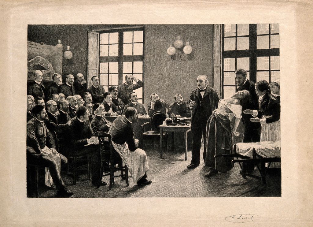 Jean-Martin Charcot demonstrating hysteria in a hypnotised patient at the Salpêtrière. Etching by A. Lurat, 1888, after P.A.A. Brouillet, 1887. Source: Wellcome Collection.