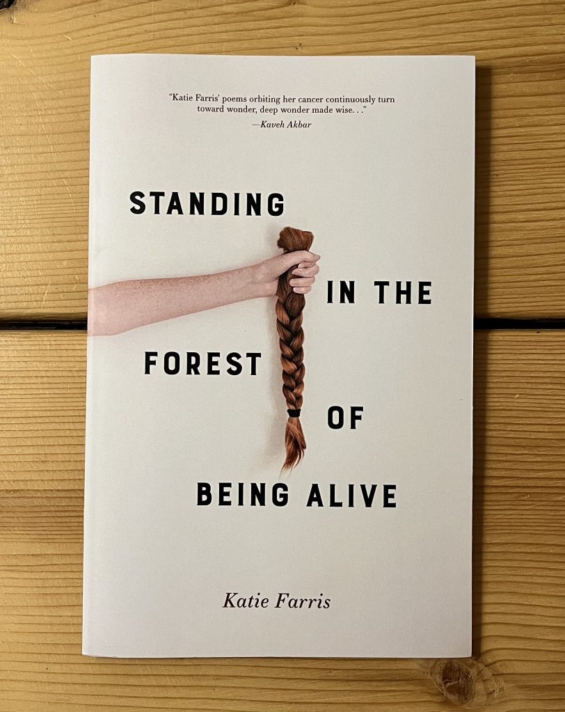 When Katie Farris’s Standing in the Forest of Being Alive was published by Alice James Press last year, I couldn’t put it down—and after I finished reading through it, I didn’t want to put it down. I kept it in my car as I drove to the National Institutes of Health for a bioethics fellowship; I brought it with me in my backpack as I shadowed the palliative care service and put my body through its biannual BRCA1 imaging. Eventually, I placed the book back on the to-be-read stack by my bedside, hoping to keep returning to it. I have.