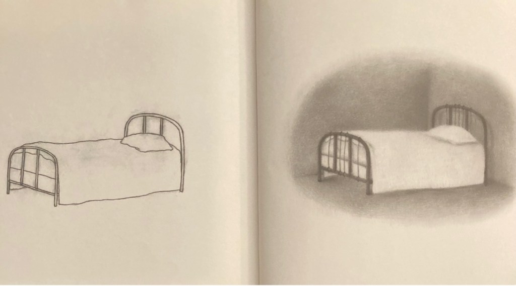 Two empty beds, the second shadowed in a penumbra, occupy h day’s final two pages. In the regime of the chronic, migraines recur and the beds await our return.
