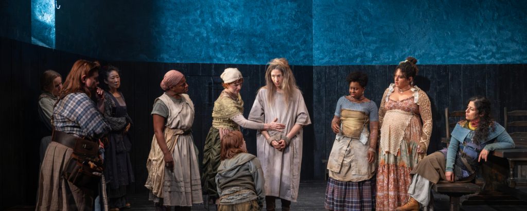 The other women listen attentively, some incredulous, some convinced. “What, so she enquired it away?” scoffs Kitty Givens (Tilly Botsford). (Kirkwood, The Welkin, 1.5, 47) Whether Kitty’s exclamation reflects either a desire for empirical proof or the ageless skepticism of women’s healing powers, even among women (or both), is left to the audience to decide. After all, the premise of the play is the task assigned to 12 women in one English village in 1759: to determine, as matrons themselves, whether or not Sally Poppy (Haley Wong), a young woman sentenced to death for murdering a young child, is pregnant—a diagnosis which could save her from hanging.