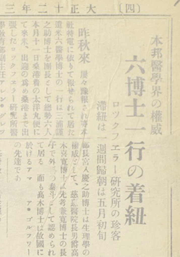 [1] “Roku hakase ichigyō no chakunyū,” March 21, 1923, Nyūyōku shinpō, page 4.