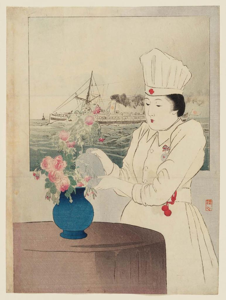 Takeuchi Keishū. Nurse (Kangofu), frontispiece illustration from Bungei kurabu, vol. 10, no. 6. April 20, 1904. Woodblock print (nishiki-e); ink and color on paper, 29.5 x 21.7 cm. Museum of Fine Arts Boston. Accession number 2000.328. https://collections.mfa.org/objects/130008/nurse-kangofu-frontispiece-illustration-from-bungei-kurab