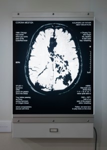 When I designed this piece, I did produce it as a Duratrans print customized for a vintage medical light box. Having the piece backlit and mounted on the wall added the right visual context for a considered kind of reading.
